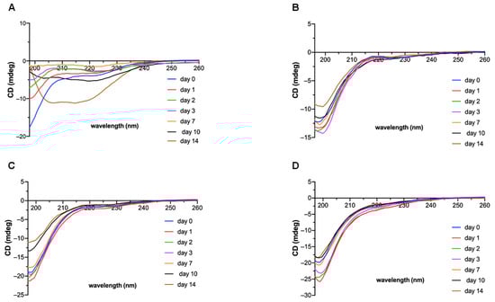 Circular dichroism (CD) spectra for the peptides (A) FC, (B) FC-GHK; (C) FC-KGHK and (D) FC-IM over 14 days incubation at a concentration of 1 mg/mL in PBS.