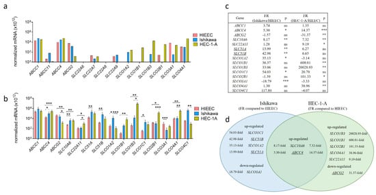 Expression of genes encoding E1-S transporters in model cell lines. (a) Expression of 14 genes involved in E1-S transport included in the PCR arrays for human drug transporters (PAHS-070Z) were examined in model cell lines, Ishikawa and HEC-1-A, and in control cell line, HIEEC. The data were normalized using normalization factor based on the expression of two most stably expressed genes (ACTB and HPRT1). (b) The expression of 15 ‘E1-S transporter genes’ was investigated in three independent experiments with two to three replicates, using newly designed primers. Statistical analysis was performed using Kruskal–Wallis test with Dunn’s multiple comparison test correction. (c) Based on normalized mRNA data, fold regulation (FR) was calculated for each gene in Ishikawa and HEC-1-A versus HIEEC. (d) Venn diagram representation of genes with significant difference in expression in Ishikawa and/or HEC-1-A compared to HIEEC. FR—fold regulation, ns—p-value > 0.05, * p-value ≤ 0.05, ** p-value ≤ 0.01, *** p-value ≤ 0.001, **** p-value ≤ 0.0001. Underlined genes are involved in E1-S efflux from cells. Data are shown as mean ± SD.