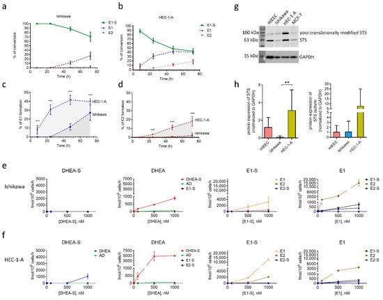 Metabolism of E1-S by Ishikawa and HEC-1-A cell lines evaluated using HPLC and LC-HRMS. Formation of metabolites E1 and E2 by Ishikawa (a) and HEC-1-A cells (b) after incubation with 16 nM [3H]E1-S was evaluated by HPLC. The levels of individual metabolites formed after 8 h, 24 h, 48 h and 72 h are shown as percentages (%) of total products. Comparison of E1-S metabolism to E1 (c) and E2 (d) in HEC-1-A compared to Ishikawa. Three independent experiments (Mann–Whitney U test). (e,f) Formation of metabolites (AD, DHEA, DHEA-S, E1, E1-S, E2 and E2-S) was evaluated by LC-HRMS in medium of Ishikawa and HEC-1-A cells 48 h after addition of 10, 100, 500 or 1000 nM DHEA-S, DHEA, E1-S or E1 in two replicates for individual treatment. (g) STS protein levels in HIEEC, Ishikawa, HEC-1-A and a positive control MCF-7. Cropped sections of one representative membrane are shown. The full-length coomassie-stained gels, Ponceau S-stained membranes, full-length membranes after chemiluminescent detection of STS and GAPDH, and densitometric readings are presented in Supplementary File, Figure S1. (h) STS levels in cell lines HIEEC, Ishikawa and HEC-1-A. GAPDH was used as a loading control. The levels of STS were determined in four independently isolated protein samples from four cell lines. Western blot was repeated independently two times. The levels of STS in each sample were normalized to its loading control. One-way ANOVA with Bonferroni’s Multiple Comparison test was used to determine statistical significance. Data are shown as mean ± SD. ** p-value ≤ 0.01, *** p-value ≤ 0.001.