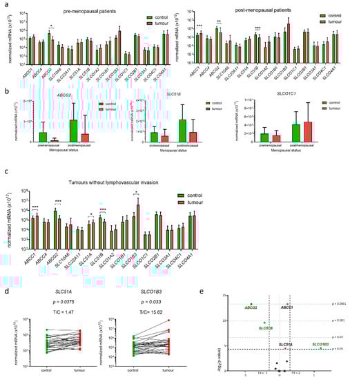 Expression of genes encoding E1-S transporters in paired tissue samples from premenopausal and postmenopausal patients and patients without lymphovascular invasion. (a) Expression in tissue samples from premenopausal patients (n = 11) and tissue samples from postmenopausal patients (n = 25). (Wilcoxon matched pairs with Bonferroni‘s multiple comparison test). (b) Effects of menopausal status on expression of three genes: ABCG2, SLC51B and SLCO1C1 (two-way ANOVA). (c) Expression of genes in samples from patients without lymphovascular invasion (n = 27) (Wilcoxon matched pair tests with Bonferroni multiple comparison correction). (d) Before-and-after graphs show the normalized mRNA levels of SLC51A and SLCO1B3 in 27 paired tissue samples. (e) Volcano plot shows fold change (FC) of normalized mRNA levels in tumours vs. controls. Data are shown as mean ± SD, * p-value ≤ 0.05, ** p-value ≤ 0.01, *** p-value ≤ 0.001.