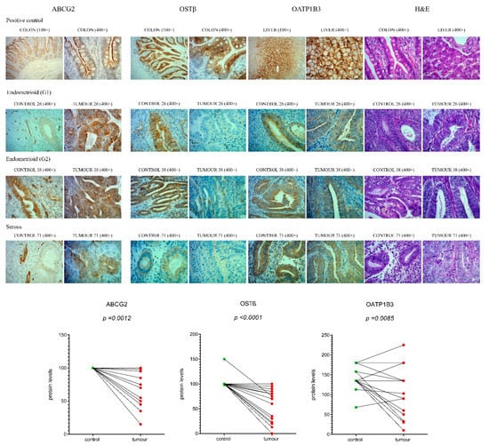 Tissue microarrays (TMA) included 3 mm cores of tumour and 2 mm cores of adjacent control endometrium from formalin-fixed, paraffin embedded tissues. In total, there were 46 tumour samples and 26 control samples of which 20 samples were paired. Immunohistochemical stainings for OSTβ, ABCG2 and OATP1B3 were performed on a fully automated Ventana BenchMark ULTRA System (Ventana Medical Systems, Inc., Tuscon, AZ, USA). In the pretreatment process, all of the protocols included Cell Conditioning Solution 1 (37 °C; Tris-based buffer with pH 8.5) and an incubation step with H2O2 to block endogenous peroxidase. All of the technical conditions of the protocols that were used for the staining are included in Table S1. The anti-OSTβ (1:100/TPBS, 1 h, HPA008533, lot A105958; Sigma Aldrich, St. Louis, MO, USA,), anti-ABCG2 (1:50/TPBS, 1 h, ab3380, lot GR308999-5, clone number BXP-21; Abcam, Cambridge, UK) and anti-OATP1B3 (1:50/TBS, 2 h, HPA004943, lot E104368; Sigma Aldrich, St. Louis, MO, USA) were used and applied manually during the immunohistochemical process. These antibodies were validated using appropriate negative and positive controls (Figure S2). For IHC with anti-OSTβ and anti-ABCG2 antibodies [], samples of normal colonic mucosa were used as positive controls, and for anti-OATP1B3 we used normal liver tissue as a positive control (Figure 6). Staining was assessed according to the percentage (P) of positive stained cells in the endometrial glands and staining intensity (I), scored as: 0, negative, 1, weak positive reaction; 2, strong positive reaction). The score was calculated by multiplying the percentage with the intensity (scoring = P × I; values ranging from 0 to maximum of 200). If the sample was duplicated the average staining score was used for statistical analysis. Immunohistochemical staining was evaluated by a pathologist (S.F-G.).