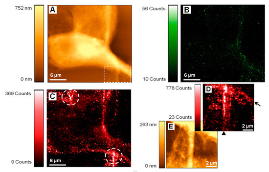 SNOM topography (A,E) and fluorescence (B–D) images of PNT2 epithelial cells with dual-labeling, which, thanks to the use of two separated filters, enables one to identify the location of the tight junction protein ZO-1 (in green) and E-cadherin (in red). The region included in the box in (A) was scanned at a higher resolution to generate the detailed E-cadherin fluorescence image (D) with the corresponding topography in (E). Circled regions in (C) and the arrow/arrowhead in (D) highlight E-cadherin clusters. The picture was published with permission [100].