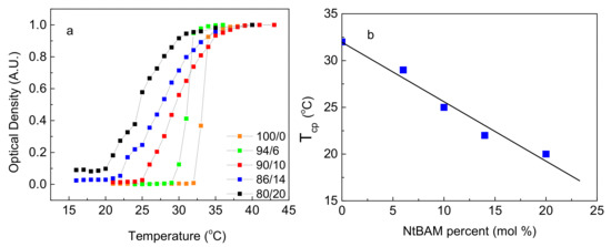 (a) Temperature dependence of the normalized optical density at 500 nm of 0.5% w/v aqueous solutions of ΡΝΙΡΑΜ-ΝΗ2 (orange), Ρ(ΝΙΡΑΜ94-co-NtBAM6)-ΝΗ2 (green), Ρ(ΝΙΡΑΜ90-co-NtBAM10)-ΝΗ2 (red) [], Ρ(ΝΙΡΑΜ86-co-NtBAM14)-ΝΗ2 (blue), Ρ(ΝΙΡΑΜ80-co-NtBAM20)-ΝΗ2 (black). (b) Tcp versus NtBAM content (mol %), the line is the linear fitting of the data (R2 = 0.962).