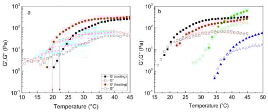 Here we should discuss Tgel, as it is defined at the crossover temperature where G’ = G”, as usually reported in the literature. This is not a real first-order transition as at T > Tgel close to Tgel, the solution still flows, behaving as a viscoelastic liquid, and it becomes an opaque free-standing gel at temperatures well above the sol-to-gel transition. Thus, Tgel denotes, in fact, the onset of thermo-induced gelation either by heating (LCST-type) or by cooling (UCST-type) []. Provided that Tgel, determined by the temperature sweep experiments, depends on the applied frequency (verified with the NaALG-g-PNIPAM sample), it is referred to as apparent gelation temperature [,,]. This is attributed to the dynamic character of association and deals with the lifetime of the physically formed reversible crosslinks concerning the experimental time. Thus, to evaluate whether real gelation occurs, frequency sweep measurements at various temperatures above Tgel should be examined.