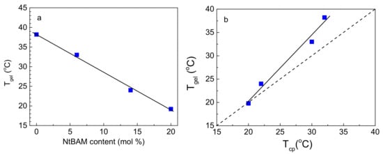 In Figure 3a, Tgel is plotted as a function of NtBAM content (mol %), exhibiting a linear decay with the hydrophobic enrichment of the grafts. It should be emphasized that although the grafting density and, in turn, the total NIPAM/NtBAM percentage of the copolymers differ, and despite their molecular polydispersity, Tgel is very well correlated with the NtBAM content of the grafting chain (R2 = 0.993), showing that this is the determining factor. Any other correlation, e.g., Tgel vs. NtBAMtotal (mol %), fails. However, when the grafting density is remarkably high (see our previous work []), there is a deviation from this relationship. The above finding implies that Tgel should also be correlated with Tcp, which is controlled by the NtBAM content, as shown in Figure 1. Hence, the lower the LCST of the grafting chains, the lower the Tgel should be. Indeed, by plotting Tgel versus Tcp (Figure 3b), a linear function can be observed, clearly showing their relationship. Another interesting observation arises from the comparison of the data with the line Tgel = Tcp. At high NtBAM content (20% mol), the two temperatures coincide, while an increasing deviation Tgel > Tcp appears as NtBAM content decreases to pure PNIPAM. This should be attributed to the strength of the side chains’ hydrophobic association, which depends both on temperature and NtBAM content. Note that PNIPAM is never entirely hydrophobic, even at sufficiently higher temperatures than its cloud point []. Thus, by enriching PNIPAM with NtBAM hydrophobic moieties, the side chains exhibit increasing stickiness, and the gel point is manifested closer to the phase transition (LCST type) of the grafting chains.