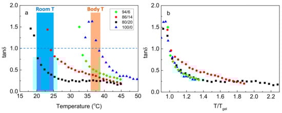 (a) Temperature dependence of the loss tangent (tanδ) at 1 Hz for the systems indicated. The two-colored zones mark the room and body temperature. (b) Loss tangent (tanδ) as a function of the normalized temperature T/Tgel (symbols as in (a)).