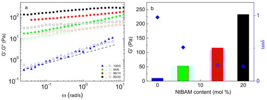 Frequency dependence of G’ (closed), G” (open) (a) for the NaALG-g-P(NIPAMx-co-NtBAMy)/water systems of different monomer compositions in the grafting chains, as indicated, at 37 °C. The slope of the dashed line is 0.5. (b) Storage modulus, G’ (at 1 rad/s) (bars) and tanδ (diamonds, right axis) versus NtBAM content (mol %) of the grafting chains.