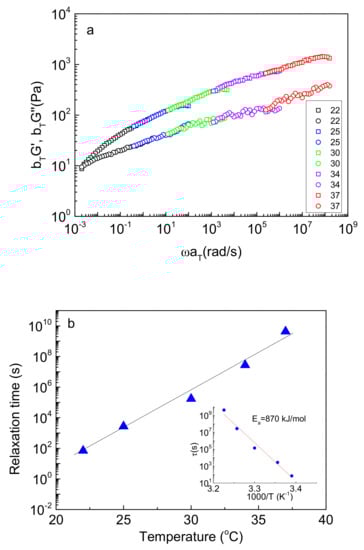 Furthermore, as seen in Figure 5a, the terminal relaxation zone is not visible for the NaALG-g-P(NIPAM-co-NtBAM) systems, implying long relaxation times. To evaluate them, frequency sweep experiments were accomplished in various temperatures from 22–37 °C for the 80/20 copolymer (Figure S10 in the Supplementary Materials) to apply the time–temperature superposition principle. Figure 6 demonstrates bTG’ and bTG” versus the reduced frequency ωaT, where aT, bT is the horizontal and vertical shift factors, respectively, using 22 °C as the reference temperature. A satisfactory master curve was achieved for the NaALG-g-P(NIPAM80-co-NtBAM20) graft copolymer/water system, which, however, exhibits a peculiarity. The loss modulus, G”, continuous to increase above the crossover point. Such behavior has not been reported by well-defined ABA triblock copolymer hydrogelators with sticky ends, while similar behavior has been reported for entangled star-shaped branched polymers [] or to our previous report that dealt with the highly branched NaALG-g-P(NIPAM90-co-NtBAM10) (Cp = 10 wt %) copolymer []. This trend may be attributed to the exponential retarded relaxation modes of the grafting chains [].