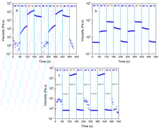 As reported recently, the injectability is correlated with the thermal and shear rate responsiveness of the formulation, as arisen from their thermo-sensitivity (Figure 2) and shear thinning behavior (Figure S12 in the Supplementary Materials), respectively []. Thus, consecutive shear viscosity time-sweep experiments were conducted at specific temperatures (20, 25, 37 °C) and under shear rates of 0.01 and 17.25 s−1. The first low value approaches the zero-shear viscosity (rest) and the second one exemplifies the shear rate applied through a 28-gauge syringe needle []. First, the hydrogel was subjected to consecutive stepwise temperature switch, under constant shear rates and at time intervals of 60 s. Figure 7a,b shows the shear viscosity changes upon temperature switch, responding instantaneously to the stepwise temperature variation. More important, the viscosity profiles are reproducible, either on increasing or decreasing temperature, demonstrating excellent temperature responsiveness.