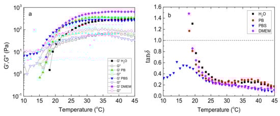 Temperature dependence of G’ (closed), G” (open) (a) and tanδ (b) (at 1 Hz, γ = 0.1%, heating rate 1 °C/min) for 5 wt % NaALG-g-P(NIPAM80-co-NtBAM20) graft copolymer in various media: water, phosphate buffer (PB), phosphate-buffered saline (PBS), Dulbecco’s modified Eagle’s medium (DMEM) (indicated in the inset).