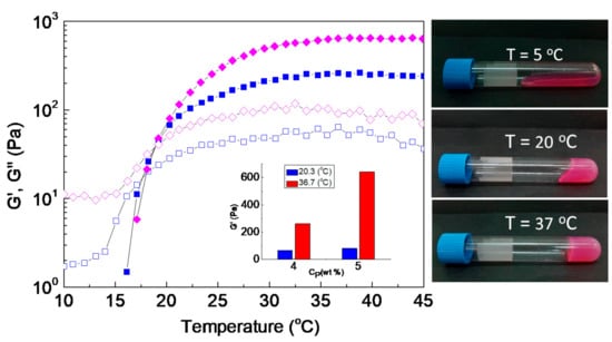 Figure 9 shows the heating sweep data for the NaALG-g-P(NIPAM80-co-NtBAM20)/DMEM formulations at 4 and 5 wt % polymer concentrations. The gelator concentration is another factor that can tune the hydrogel properties. From the data of Figure 9, it seems that concentration affects slightly Tgel, about 1 °C (Table S2 in the Supplementary Materials), while it significantly affects the network elasticity well above Tgel. For instance, at room temperature, G’ is about similar for both 4 and 5 wt % concentrations. On the contrary, at body temperature, when Cp decreases from 5 to 4 wt %, G’ also decreases (by a factor of 2.4) (inset of Figure 9). The formulation exhibits sol state at low temperature (e.g., at 5 °C), viscoelastic liquid (soft gel) at 20 °C and free-standing gel (stiff gel) at 37 °C (Figure 9, digital photos).