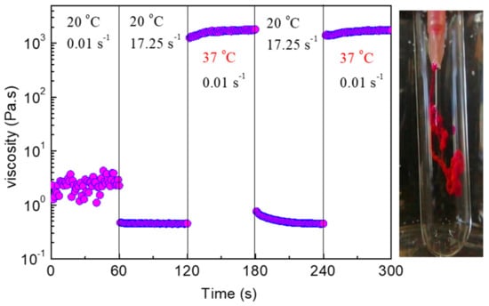 Shear viscosity versus time of a 4 wt % NaALG-g-P(NIPAM80-co-NtBAM20)/DMEM formulation subjected to consecutive variations of shear rate and/or temperature, as indicated, in time intervals of 60 s. The digital photo (right) shows injection of the formulation through a 28 g needle in water, regulated at 37 °C.