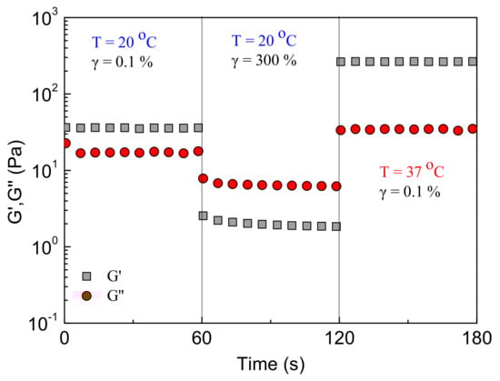An oscillatory shear experiment was designed to explore the formulation’ response to high shear deformation and gel recovery upon cessation of strain. The formulation was subjected to stepwise time sweep under different conditions: at 20 °C, applying a shear amplitude, γ, of 0.1% (linear viscoelastic regime); after 60 s, γ was switched to 300% (well beyond linear viscoelastic regime); after further 60 s, the temperature was increased at 37 °C and simultaneously γ was lowered back to 0.1%. The results are presented in Figure 11. As observed, at 20 °C and low strain, the formulation behaves as a weak gel (G’ > G”), with a storage modulus of 35 Pa and tanδ = 0.47. Upon applying high strain in the nonlinear regime, the network is disrupted instantly, and the formulation flows (G’ < G” and tanδ = 3.3) with low G’ ~2 Pa. Finally, in the third step, a stiff gel is recovered at 37 °C (G’ > G”), as suggested by the high value of G’ (260 Pa) and the low value of tanδ = 0.13.