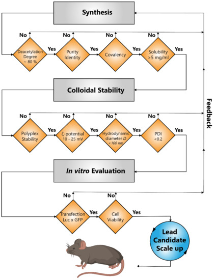 Screening cascade of depolymerized chitosan (dCS)–PEI–based delivery vectors. Identification of a lead candidate was guided by defined chemical properties of the polymer, the indicated physicochemical characteristics of the polyplexes to be met, and biological performance in vitro (i.e., transfection efficiency and cytotoxicity) using the hepatic HuH–7 cell line. Following synthesis, the resulting polymer was chemically identified by 1H NMR and tested for covalent bonding by 2D–diffusion ordered spectroscopy (DOSY) NMR. Only compounds with a solubility of >5 mg/mL were selected for further characterization. Colloidal stability was assessed after DNA complexation. In vitro performance was evaluated by using two reporter gene vectors (n.CAGLuc2 and n.CAG.GFP1). The lead candidate is characterized by favorable safety and transfection profiles in vitro allowing for in vivo evaluation of transfection efficiency.