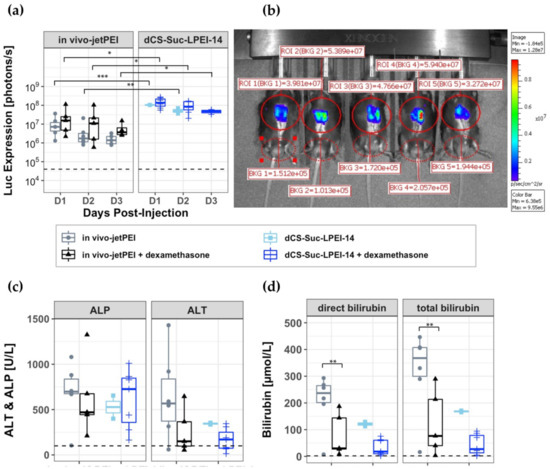 Subsequent to the in vitro evaluation, the lead candidate dCS-Suc-LPEI-14 was tested in vivo to confirm the validity of our approach. For the experiments in mice, the commercial transfection reagent in vivo-jetPEI was used as a reference. Furthermore, the experiments were carried out with and without dexamethasone pretreatment [64,65] to suppress proinflammatory processes as we observed liver toxicity as indicated by serum markers and jaundice. Dexamethasone premedication is a standard procedure in clinical trials with test medications such as lipid-based delivery systems where adverse immune events or infusion-related reactions have to be avoided [66]. Indeed, pretreatment with dexamethasone was clearly beneficial with respect to a reduction of ALT and both bilirubin markers but had no statistically significant impact on transgene expression (Figure 5c,d). Our non-integrating nanovector-DNA, under the control of a liver-specific P3 promoter [67,68,69] and coding for luciferase, was administered by retrograde intrabiliary infusion. This is an established and efficient way to deliver polymeric delivery vectors to the liver in rodents [70], and is in contrast to a systemic administration [70,71]. Direct intrabiliary infusion allows substantial reduction of the amounts of DNA and polyplexes required. In these experiments only 1 µg nanovector-DNA was administered.