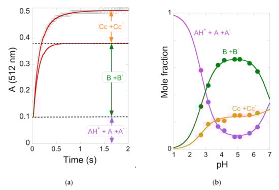 The most accurate method to determine the equilibrium constants reported in Scheme 3 is based on the reverse pH jumps (defined by the addition of acid to ensure pH ≤ 1 of equilibrated solutions, or pseudo-equilibrated, at higher pH values) [] monitored by stopped flow []. In Figure 2a, the trace of a typical reverse pH jump is shown. Three amplitudes are observed. The first is due to the flavylium cation absorption resulting from the conversion of all quinoidal bases (neutral and anionic) during the mixing time of the stopped flow together with some flavylium that is in equilibrium prior to the pH jump (for lower pH values). The amplitude of the faster kinetic step results from the conversion of hemiketal (neutral and anionic) into flavylium cation, because at pH ≤ 1 the change of regime causes the hydration/dehydration to be faster than the tautomerization [,]. The final amplitude corresponds to the formation of more flavylium cation from cis-chalcone (neutral and anionic) via hemiketal. Normalization of these amplitudes to the unit directly yields the mole fraction distribution of these species at the pseudo-equilibrium as shown in Figure 2b. The experimental data obtained for kuromanin in Figure 2 and Figure 3 was used to calculate the equilibrium constants reported in Figure 1 according to the mathematical expressions derived in []. Once these constants were obtained, the energy level diagram can be constructed considering that ΔG° = RT lnK, where ΔG° is the Gibbs free energy, R is the ideal gas constant, T is the absolute temperature (Kelvin degrees), and K is the equilibrium constant of the chemical reaction [,].