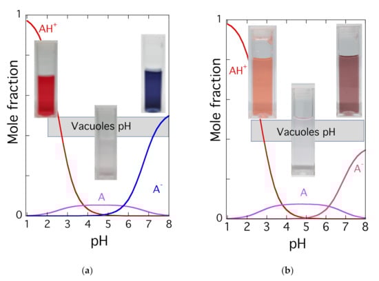 Anthocyanins are located in the vacuoles. The pH of the vacuoles may vary considerably, but a pH of approximately 5 is often observed []. However, the pH of the vacuoles could be as low as 2.0 in citrus fruits [] and 7.7 or more in some flowers, Figure 4 []. In anthocyanins, the colored species are flavylium cation and quinoidal bases (neutral and anionic). In the case of simple anthocyanins such as malvidin-3-O-glucoside (oenin) and cyanidin-3-O-glucoside (kuromanin), the appearance of color at the equilibrium is only observed for the flavylium cation at very low pH values, and at moderately acidic pH values the mole fraction of the quinoidal base is low. Consequently, neither flavylium cation nor quinoidal base can confer significant color at moderately acidic solutions, as shown in the photos of Figure 4. Curiously, at pH values close to neutrality, the color of the anionic quinoidal base is accessible but at these pH values these anthocyanins are unstable. It is also interesting to note that, despite the generally accepted view by the scientific community and contrary to what can be observed for oenin, the ionized quinoidal base (A−) of kuromanin seems to not confer the blue color to the solution (see Figure 4). To investigate the phenomenon in more detail, a series of direct pH jumps from pH = 1 to higher pH values (up to pH = 12) were performed using stopped flow to calculate the four deprotonation constants. This technique allows for the fast (ca. 10 ms after the pH jump) acquisition of the absorption spectra, which are necessary to investigate the acid-base equilibria without interference of the hydration and subsequent reactions that lead to color fading. Figure 5a shows the plots of absorbance versus pH, at four different wavelengths, that were used to obtain the respective pKa values for the formation of the quinoidal base and its ionized forms from the flavylium cation. Using this methodology, the following values were obtained: pKa1 = 4.0; pKa2 = 6.5; pKa3 = 10.0; and pKa4 = 12.2. These values compare to those obtained for oenin: pKa1 = 3.9; pKa2 = 6.3; and pKa3 = 8.4 []. Although the first two values are reasonably similar, the pKa3 for the formation of the di-ionized quinoidal base is considerably higher for kuromanin. By combining the pH-dependent mole fraction distribution of the flavylium cation and all quinoidal bases with the respective spectral data, it is possible to obtain the spectra of the five species by spectral decomposition (Figure 5b). The results clearly show that the spectrum of A− cannot account for the blue color (in contrast with A− of oenin, which is relatively red-shifted) and that this color can only be expressed by A2− and A3−, which appear only at very basic pH values. As these conditions do not seem feasible in biological systems, the results suggest that kuromanin can only express the blue color when complexed with metal cations or by another mechanism that may shift the third and fourth pKa to lower values.