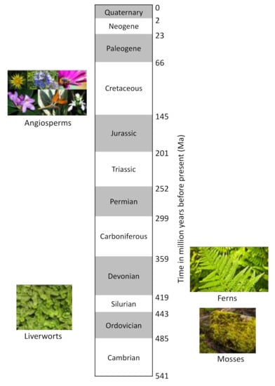 - Morris, J.L.; Puttick, M.N.; Clark, J.W.; Edwards, D.; Kenrick, P.; Pressel, S.; Wellman, C.H.; Yang, Z.; Schneider, H.; Donoghue, P.C.J. The timescale of early land plant evolution. Proc. Natl. Acad. Sci. USA 2018, 115, E2274–E2283. [Google Scholar] [CrossRef] [PubMed]