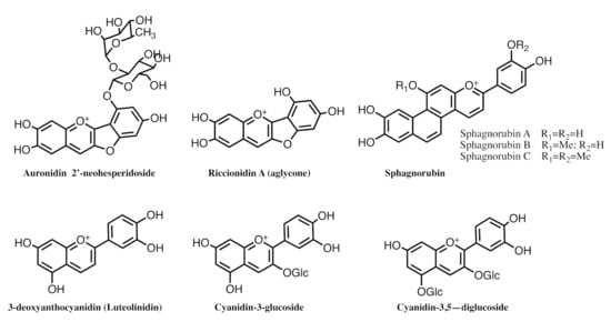 Color is ubiquitous in nature and anthocyanins are the largest class of water-soluble compounds present in the plant kingdom responsible for a range of colors in plants, from orange-red to purple-blue hues. Anthocyanins are glycosylated forms of anthocyanidins, normally occurring as 3-glycosides or 3,5-diglycosides (Scheme 2). Different types of monosaccharides (e.g., glucose, galactose, rhamnose, and arabinose) and disaccharides (e.g., rutinose, sambubiose, and sophorose) can be attached to the flavylium core, and these sugars can also be acylated with cinnamic acids (e.g., caffeic, coumaric, ferulic, and sinapic acids) or aliphatic acids (e.g., acetic, malic, oxalic, and succinic acids) []. Related to anthocyanins are 3-deoxyanthocyanidins, found in mosses and ferns, sphagnorubins found in peat moss [,], and auronidins (furanoflavylium derivatives) (Scheme 2) []. Andersen and Davies, questioned whether “auronidins might contribute to the remarkable ability of liverworts to survive in extreme environments on land, and their discovery calls into question the possible pigment status of the first land plants” [].