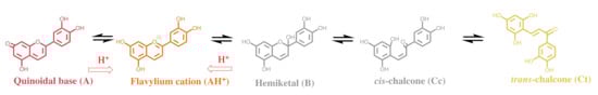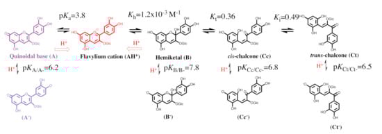 In anthocyanins and many other flavylium-derived multistate of species, the isomerization is clearly the slowest process of the kinetics and a pseudo-equilibrium can be defined as a transient state obtained before significant formation of trans-chalcone (Equations (1)–(3) and Equations (5)–(7)) and the respective pseudo-equilibrium constants defined by Equations (13)–(16):