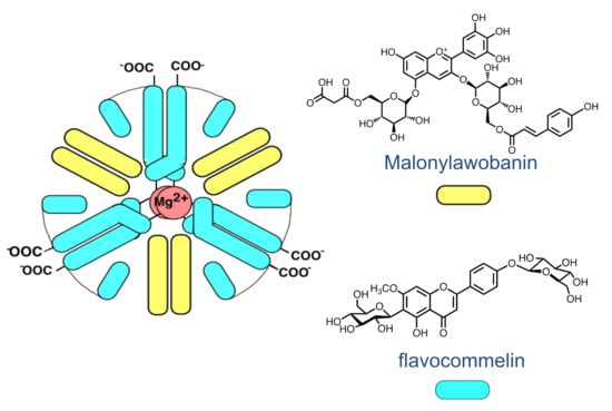 The quinoidal base of luteolinidin is red and the anionic quinoidal base is orange. There is no blue color. The blue color appears to be the most demanding in terms of the evolution. The excellent review by Yoshida et al. provides an overview of the structures used to express this color []. Intermolecular and intramolecular copigmentation (in acylated anthocyanins) and metal complexation are the strategies used to obtain a blue color. The most sophisticated structures (from the chemical perspective) are metaloanthocyanins, for example, the one that confers color to Commelina communis (Scheme 6). In this supramolecule, two metals, six anthocyanins, and six flavanones are organized in two parallel plans.