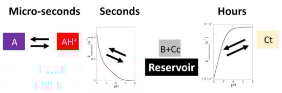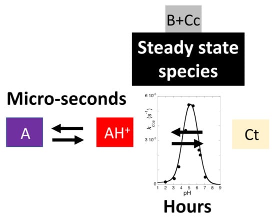 In a direct pH jump, AH+/A conversion into Ct occurs via a single step of pseudo-first order kinetics. Considering AH+ in fast equilibrium with A (X) on one side and B in fast equilibrium with Cc (Y) on the other to produce Ct (Z), a mechanism equivalent to a reversible kinetic scheme involving three species is required. When the steady state approach is applied to Y, Equation (19) can be derived []: