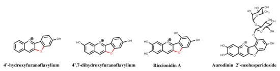 We verified that as 4′-hydroxyfuranoflavylium [], 4′,7-dihydroxyfuranoflavylium [], and riccionidin A, the aglycone of auronidin-2′-neohesperidoside [], follow the same multistate of species of anthocyanins and 3-deoxyanthocyanins (Scheme 10) []. Riccionidin A was identified in several liverworts, for example, in the Antarctic Cephaloziella varians, in response to an abrupt increase in UV-B radiation [], in in vitro cultures of Ricciocarpos natans [], and in adventitious root cultures of the Anacardiaceae Rhus javanica [].