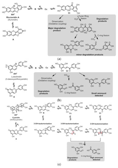 It was possible to identify the species AH+, A, B, Cc, and Ct by HPLC/MS [] before decomposition (Scheme 11a) confirming that the multistate of species is the same as that of anthocyanins (Scheme 11c) and 3-deoxyanthocyanins (Scheme 11b). Moreover, the degradation products of these three families appeared to be similar (Scheme 11).