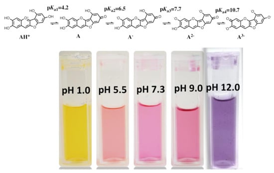 - Alejo-Armijo, A.; Parola, A.J.; Pina, F. pH-dependent multistate system generated by a synthetic Furanoflavylium compound: An ancestor of the anthocyanin multistate of chemical species. ACS Omega 2019, 4, 4091–4100. [Google Scholar] [CrossRef]