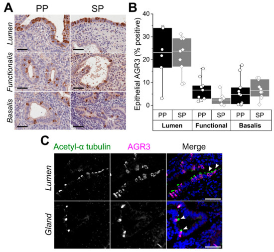 Anterior gradient protein 3 (AGR3) expression in the healthy human endometrium. (A) Representative micrographs demonstrate AGR3 immunostaining in proliferative phase (PP) and secretory phase (SP) endometrium. (B) Epithelial AGR3 immunostaining scores across subanatomical regions of the cycling endometrium. (C) Representative immunofluorescence micrographs show co-staining of acetylated-α tubulin (green) and AGR3 (magenta) in ciliated luminal and glandular endometrial epithelial cells. Tissue sections were counterstained with DAPI (blue). Ciliated cells expressing AGR3 are highlighted with white arrowheads. Scale bars 50 μm throughout.
