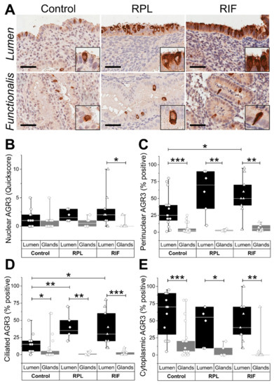 Endometrial AGR3 expression in control and recurrent reproductive failure. (A) Representative micrographs demonstrate AGR3 immunostaining in endometrial tissue from fertile (control), recurrent pregnancy loss (RPL), and recurrent implantation failure (RIF) patients. Scale bar 50 μm. Immunostaining scores for (B) nuclear, (C) perinuclear, (D) ciliated, and (E) cytoplasmic AGR3 expression in the luminal and glandular epithelium. * p < 0.05, ** p < 0.01, and *** p < 0.001.