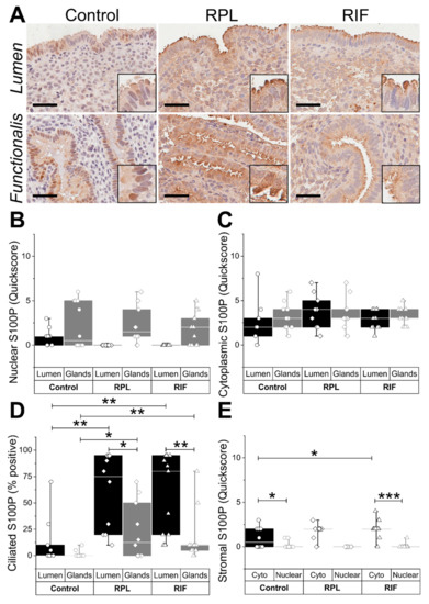S100P immunoreactivity in the epithelial sub-types and the subcellular locations in the healthy fertile endometrium were different to the S100P staining patterns in the endometrial samples harvested from women with RPL and RIF. Nuclear S100P in particular was seen in the LE of the fertile control samples harvested in the WOI, whereas an absence of nuclear S100P immunoreactivity was observed in the WOI of the RPL and RIF samples (Figure 3A,B). Ciliated cells of the LE of the RPL/RIF samples demonstrated significantly higher (p < 0.01) S100P immunostaining compared with the control samples (Figure 3A,D).