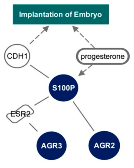 By examining the Ingenuity Knowledge Base, we were able to identify a mechanistic network between S100P, AGR3, AGR2, and embryo implantation (Figure 4). This network shows direct protein–protein interactions between S100P and AGR2, and AGR3 and oestrogen receptor β (ESR2). Here, we demonstrate a causal relationship between embryo implantation via E-cadherin (CDH1) and progesterone. Progesterone was seen to indirectly lead to expression of S100P.