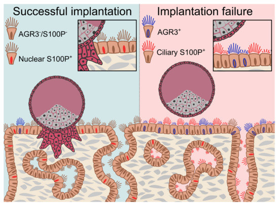 We described the presence of AGR3 protein in human endometrial epithelial cells for the first time, and demonstrated differential endometrial AGR3 and S100P immuno-expression levels during the WOI in women with a history of RPL and/or RIF. The observed higher immunoreactivity for these two calcium-binding proteins in the ciliated LE cells of women with a history of recurrent reproductive failure suggests their erroneous subcellular location may contribute to the pathophysiology of these conditions. The nuclear localisation of S100P is essential for its transcriptional regulatory function, which may be necessary for implantation of a viable pregnancy (Figure 5).