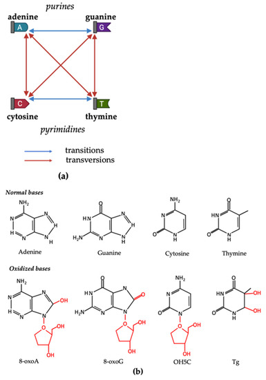 ROS-induced structural modifications on four DNA nucleobases—adenine, cytosine, guanine, and thymine. (a) DNA transitions and transversions. Blue lines represent transitions (changes between adenine and guanine, or cytosine and thymine). Red lines represent transversions (changes between purines and pyrimidines). (b) On top, nucleotides in DNA molecules: adenine, guanine, cytosine, thymine; and below, their major oxidized products: 8-oxo-2′-deoxyadenosine (8-oxoA), 8-oxo-2′-deoxyguanosine (8-oxoG), 5-hydroxy-2′-deoxycytidine (OH5C), and thymine glycol (Tg).