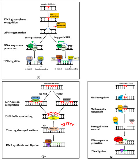 When oxidative stress results in bulky damage, or even whole DNA strand disruption, NER will take over. NER commonly consists of four steps: (1) DNA lesion recognition, (2) DNA helix unwinding, (3) incision making and subsequent excision of a damaged section and (4) DNA synthesis and ligation (Figure 2b). More than thirty proteins can be included in NER to handle a broad range of DNA damage types [95]. NER has two sub-processes: transcription-coupled NER (TC-NER) and global genome NER (GG-NER). The two sub-processes only differ in the initial recognition step. In GG-NER, the initial recognition of DNA lesions is achieved by the XPC-RAD23B complex, mainly comprised of xeroderma pigmentosum complementation group C and UV excision repair protein radiation sensitive 23 homolog B. In TC-NER, the function of this complex is replaced by a stalled RNA pol II complex, crucial for assembly of a number of TC-NER-associated enzymes [96]. Once the DNA lesion is recognized, the two sub-processes converge by the unwinding of DNA strands and exposure of bulky lesions using the base transcription initiation factor IIH and recruiting xeroderma pigmentosum complementation group D (XPD). Then, the NER machinery—DNA excision repair protein 1/xeroderma pigmentosum complementation group F (ERCC1/XPF)—cuts the damaged DNA sequences and new sequences will be regenerated by POLD and POLE. Finally, LIG1 seals the remaining nick [95].