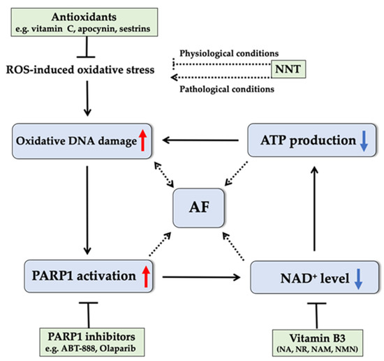 Another promising therapeutic option to prevent the vicious cycle of “oxidative DNA damage—excessive PARP1 activation and NAD+ depletion” in AF is through exogenous replenishment of NAD+ and/or its various forms of precursors [26]. NAD+ can be synthesized de novo from tryptophan but is mostly acquired via various dietary forms of vitamin B3 (VitB3): nicotinic acid (NA), NAM, nicotinamide riboside (NR), and nicotinamide mononucleotide (NMN) [161,162]. In particular, supplementation of NA, NMN, or NR has been shown as an effective strategy for boosting NAD+ levels in mouse models of aging [163,164,165], vascular diseases [166], and diabetes [167]. High dose NA supplementation can cause side effects, such as flushing [168]. While high dose NR supplementation has shown effectiveness in some disease models (e.g., obesity [169], diabetic neuropathy [170], dilated cardiomyopathy [171]), adverse effects on metabolism were also observed in overweight but otherwise relative heathy conditions, which might be attributed to the specific NNT containing genotype of mouse model [172,173]. This could suggest that efficacy of VitB3 supplementation is dependent on the presence of health conditions with a high NAD+ demand, such as those occurring in AF. VitB3, like other B-vitamins, has a key role in mitochondrial metabolism [174]. Sufficient VitB3 intake is essential to maintain mitochondrial function, balance levels of mitochondrial signaling metabolites, and prevent metabolic stress, while a dysregulated VitB3 metabolism leads to increased levels of mitochondrial ROS emission and oxidative DNA damage [175]. VitB3 thus may offer substantial therapeutic benefits for AF initiation and progression (Figure 3). Various dietary forms of VitB3 were shown to slow down oxidative stress-related heart diseases mostly by affecting NAD+ biosynthesis. Of potential relevance, NAM is not only a NAD+ precursor, but also a PARPs inhibitor [176], potentially exerting a dual pharmacodynamic effect on cardiomyocyte remodeling in AF. Interestingly, it was reported that NAM supplementation prevented experimental AF [177], also showed an amelioration of left ventricular contractile dysfunction, and attenuated progression of cardiac hypertrophy and heart failure by normalizing NAD+ levels [178]. NR represents a potential therapy for diseases in which NAD+ depletion has been implicated, such as AF and heart failure [179]. Supplementation of NMN, but also with NAM or with NR, has the potential to attenuate NAD+ imbalance and oxidative DNA damage as promoting factors of AF induction and maintenance.