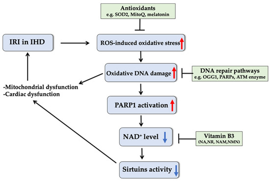 IHD is one of the leading causes of mortality in the world [180]. IRI is the most common consequence of IHD, generally resulting in necrosis and apoptosis, as well as a transient reduction of contractility of surviving myocardium [181]. In ischemic conditions, anaerobic glycolysis plays the dominant role in producing ATP within heart muscles after a very short time of complete or partial obstruction of coronary arteries, and excess H+ is intracellularly synthesized during glycolysis [181,182]. Once reperfusion and reoxygenation occur, when blood re-enters the tissue following ischemia, the cardiac tissue can only work at a quite ineffective rate due to aggravated arrhythmias, microvascular injury, and myocardial dysfunction, etc. [183,184,185], mainly resulting from the imbalance of electrolytes [186]. Reperfusion results in a ROS burst, which is a major contribution to reperfusion injury. The ROS burst and the series of pathophysiological modifications in the course of IRI resulting from an extreme mitochondrial redox condition further stimulate net ROS emission. Excessive ROS production induces oxidative DNA damage and activates PARP1, resulting in depletion of intracellular NAD+ and ATP [187,188]. NAD+ is also a rate-limiting co-substrate for sirtuin family proteins (SIRT1-7), which all serve as important regulators of redox homeostasis and are implicated in various cardiac diseases [189,190]. NAD+ depletion will thus lead to reduction in the activity of SIRT1 [191] and SIRT3 [192], which impairs mitochondrial biogenesis and antioxidant defense, further enhancing mitochondrial dysfunction, one of the hallmarks of IRI [193] (Figure 4).