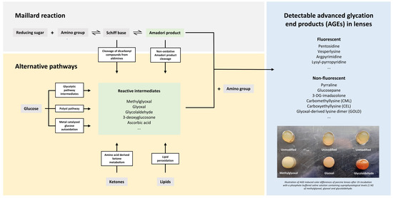 Advanced glycation end products (AGEs) are synthesized endogenously via the Maillard reaction and several alternative pathways [6]. In the early steps of the Maillard reaction, an iminine intermediate (Schiff base) is formed by the reaction of a reducing sugar (e.g., glucose) with a protein-bound amine or free amino acid. The labile Schiff base can produce highly reactive dicarbonyls (e.g., methylglyoxal) or rearrange into stable Amadori products. In the advanced steps of the Maillard reaction, the Amadori products undergo complex rearrangements, cleavage and covalent binding reactions, which eventually give rise to the generation of AGEs, which are stable adducts and cross-links of proteins [6,7]. Highly reactive carbonyls can also be generated from glycolytic pathway intermediates, the polyol pathway, glucose autoxidation, ketones generated by the breakdown of amino acids and lipid peroxidation. Those carbonyl compounds initiate the process of advanced glycation directly, eventually leading to the synthesis of a wide range of fluorescent (e.g., pentosidine) and non-fluorescent AGEs (e.g., glucosepane), which can be found in human tissues including eye lenses [6].