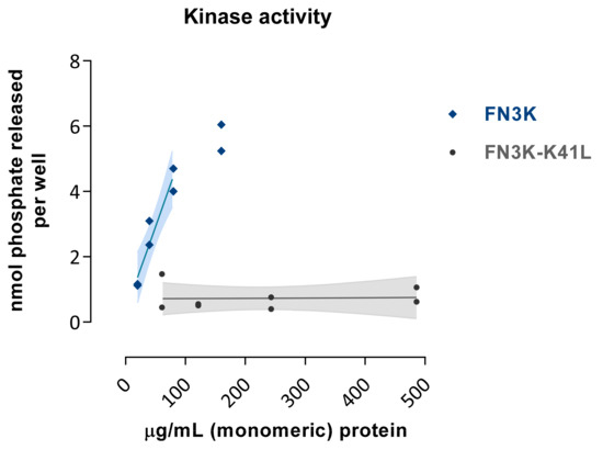 Kinase activity of FN3K and the inactive mutant enzyme FN3K–K41L as assessed by the amount of phosphate released per well (nmol) using a 1-deoxy-1-morpholino-D-fructose (DMF) acceptor substrate at increasing enzymatic concentration levels (µg/mL). Data are depicted as single data points with their fitted regression line in the linear range and 95% confidence interval.