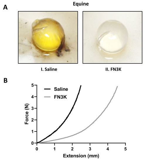 While the lenses of the equine FN3K-treated eyes (n = 3) appeared to be clear, the saline-treated lenses (n = 3) had a yellowish-brown color. Following FN3K treatment, complete color restoration could be observed within 30 min (Figure 3A). For a force up to 5 N, the extension rate of one of the equine FN3K-treated lenses appeared to be more than twice the extension rate of the saline-treated lens (Figure 3B).