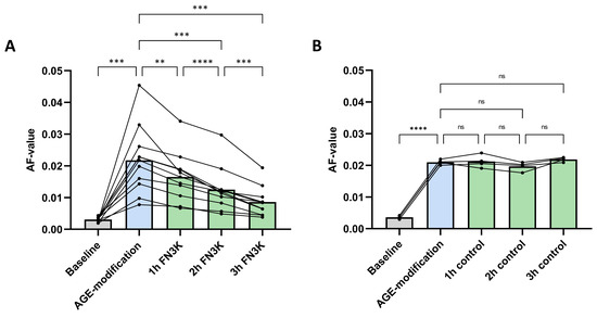 (A) Autofluorescence (AF) values of glycolaldehyde-induced advanced glycation end product (AGE)-modified porcine lens fragments after fructosamine-3-kinase (FN3K, n = 11) and (B) control (n = 4) treatment with the cofactors ATP and MgCl2 solely. The bars represent the mean. **** p < 0.0001; *** p < 0.001; ** p < 0.01; ns, non-significant.