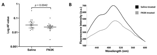 Concerning the AF values, the Wilcoxon test revealed that the median of the differences between saline-(n = 20, median 0.033, IQR 0.021–0.051) and FN3K-(n = 20, median 0.024, IQR 0.019–0.029) treated lenses was statistically different (p = 0.0042, Figure 5A). Figure 5B illustrates the median fluorescence emission spectra (400–620 nm range) for both treatment conditions.
