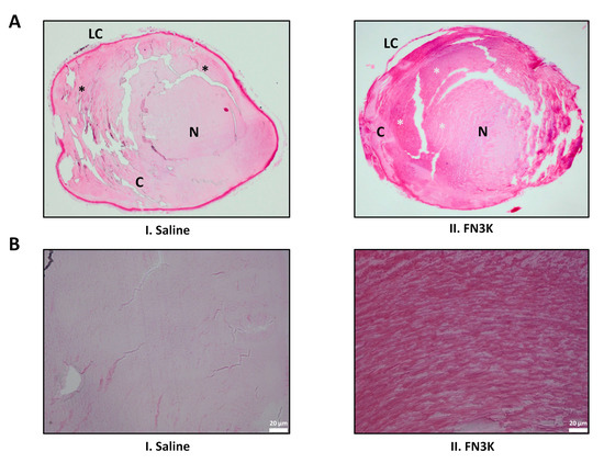 (A) Hematoxylin and eosin-stained sections of a saline (I) and FN3K treated (II) lens originating from the same ob/ob mouse. Disorganized and organized zones of lens fibers are indicated with black and white asterisks, respectively. C, cortex; LC, lens capsule; N, nucleus. (B) Close-up on the cortical lens fibers of the saline (I) and FN3K treated (II) lens.