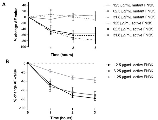 Figure 8A shows the mean change (%) of AF values compared to baseline levels for cataractous human lens suspensions in function of incubation time at a higher concentration range of both the active and mutant FN3K enzyme: 125 µg/mL, 62.5 µg/mL and 31.8 µg/mL. While only small or negligible changes of AF values were noticed in the case of the mutant enzyme, remarkable decreases were observed for the active enzyme. Similar kinetics were found at all concentrations levels. The most pronounced decrease of AF values was observed after 1 h incubation (43.6–49.7% decrease compared to baseline). While after the second hour some additional progression of the chemical reaction was observed (56.7–70.8% decrease compared to baseline), AF values remained rather stable after the third hour (56.6–77.4% decrease compared to baseline). The latter suggests the completion of the reaction process at the end of the experiment. Figure 8B shows the mean change (%) of AF values compared to baseline levels in function of incubation time at a lower concentration range of active FN3K (12.5 µg/mL, 6.25 µg/mL and 1.25 µg/mL). In contrast to the experiment performed in the higher range, a more notable time- and dose-dependent effect was observed. While similar kinetics were noted for lens suspensions incubated with 12.5 µg/mL and 6.25 µg/mL of active FN3K, the reaction process appeared to be explicitly slower for suspensions incubated with 1.25 µg/mL. At all concentration levels, an additional decrease of AF values was seen after 3 h of incubation which suggests an ongoing reaction process. Additional control experiments revealed that neither the added ATP nor the ADP released by the active enzyme, was responsible for the observed decreases in AF after FN3K treatment (Appendix B).