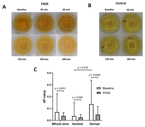 Figure 9A shows a time-lapse of the macroscopic changes observed after FN3K treatment of a cataractous human eye lens. After 30 min, an improvement of the color of the cortex and homogeneity could be observed. During a follow-up in the subsequent 2.5 h, the light exposure was changed, which hampered the interpretation of the color intensities in the pictures. However, independent of light exposure differences, a further amelioration of the color of the cortex and homogeneity could be observed. Some minor additional improvements were found at the end of the monitoring period (after 3 h). No remarkable color changes could be observed in the case of the saline-treated lens (Figure 9B). For another cataractous human eye lens, a Mann–Whitney U test on spectral measurements of the whole lens revealed a statistically significant decrease of the AF value after ex vivo incubation of the intact eye lens with FN3K (median 0.037, IQR 0.018–0.063) compared to baseline levels (median 0.069, IQR 0.033–0.20, p = 0.0011). AF values appeared to be significantly lower at the ventral surface of the lens (median 0.036, IQR 0.029–0.13) compared to the dorsal surface (median 0.14, IQR 0.057–0.34, p = 0.019). Furthermore, AF values at the dorsal surface of the lens showed a stronger decrease after FN3K treatment (median 0.048, IQR 0.022–0.11, p = 0.0084) compared to the ventral surface (median 0.024, IQR 0.017–0.047, p = 0.029, Figure 9C).