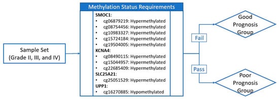 Schematic diagram of sample grouping criteria. If the sample meets methylation status requirements for all ten CpG sites (represented by probe IDs from the array product design), it is assigned to the poor prognosis group. If the sample fails one or more of the methylation status requirements, it is assigned to the good prognosis group. Hypo- or hypermethylation status of the sample is determined through comparison with the group median methylation level.