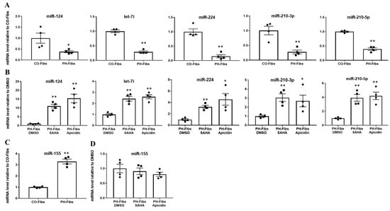 Besides miR-124, human PH-Fibs exhibit significantly decreased levels of let-7i, miR-224 and miR-210, which can be increased by HDACi. qRT-PCR analysis of mature miR-124, let-7i, miR-224, miR-210 and miR-155 levels in human CO- (n = 4) and PH-Fibs (n = 4) (A,C) or in human PH-Fibs treated with DMSO (control) or HDACi (SAHA and apicidin) for 48 h (B,D). Data are presented as mean ± S.E.M, * p < 0.05, ** p < 0.01 PH-Fibs vs. CO-Fibs or PH-Fibs treated with HDACi vs. DMSO.