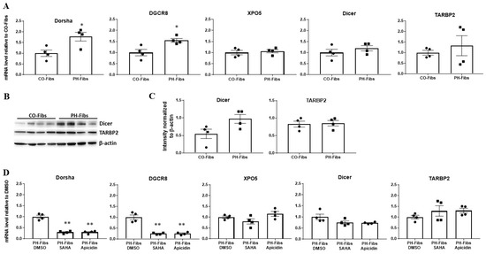 2.2. The Decreased Levels of Mature miRNAs in Human PH-Fibs Are Not Due to Reduced Levels of miRNA Processing Genes