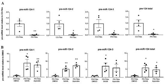 2.3. PH-Fibs Exhibit Decreased Levels of miR-124 Precursors, Which Can Be Restored by HDACi